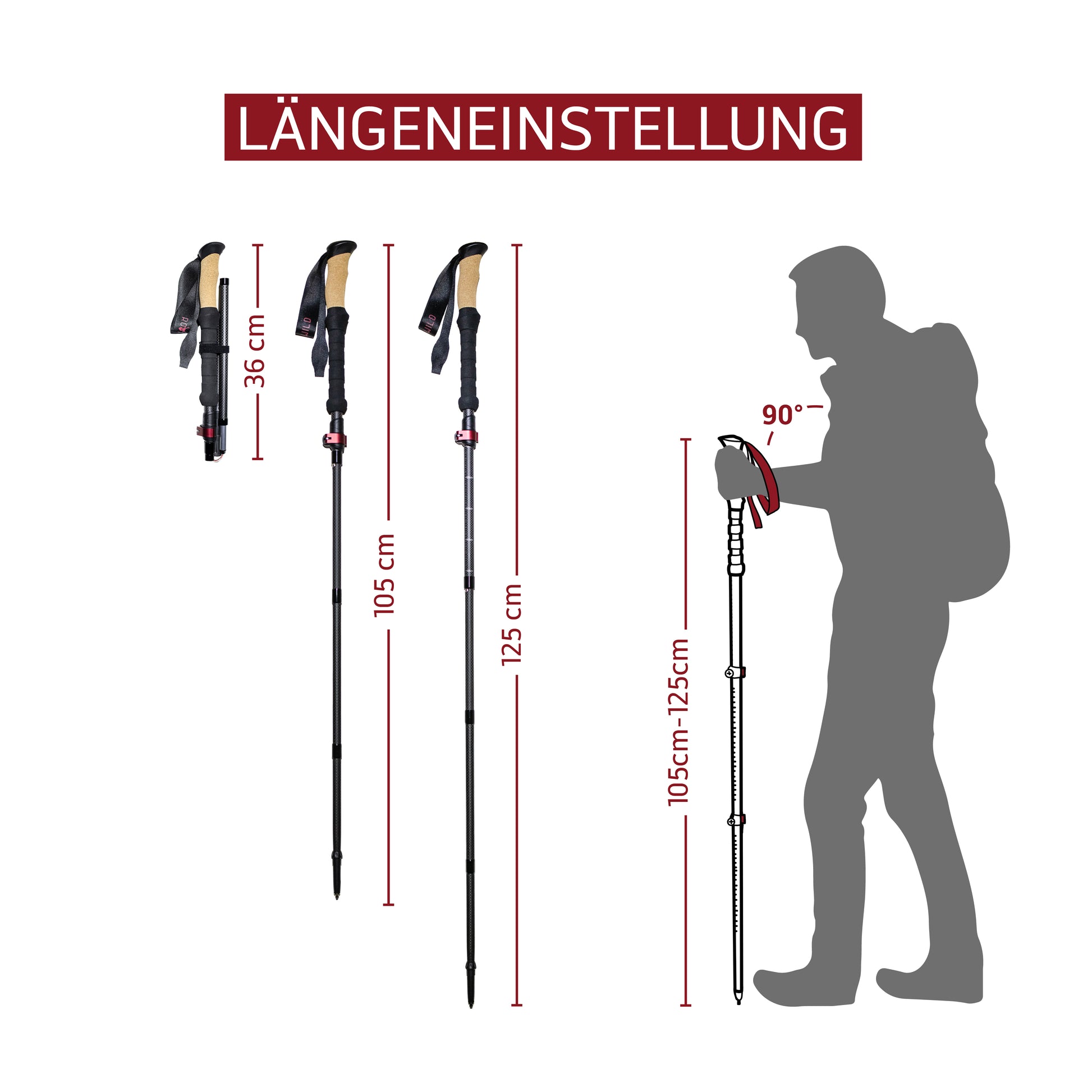 Bei unseren Faltstöcken empfehlen wir bis zu einer Körpergröße von 1,75m die kürzere Variante (105-125cm), darüber die längere Variante (115-135cm). Damit haben Sie für die oben empfohlene Stocklänge jeweils ein paar cm Spiel nach oben und unten, so dass Sie die Stöcke auf Ihre persönliche Wohlfühllänge einstellen können.